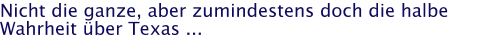 Es gibt auch jede Menge deutscher Ansiedlungen hier, die da z.B. Weimar, Nienburg, Fredericksburg, Boerne oder New Braunfels heißen. Und die Deutschen waren es letztlich auch, die den TexMex erfunden haben. Wirklich. Die waren nämlich zuerst hier. Nach den Indianern natürlich. Und als sie mit denen eine zeitlang die Friedenspfeife geraucht hatten, bemerkten sie, dass ihnen der Tabak gar nicht schmeckt. Also haben sie die Mexikaner reingeholt, aber als sie merkten, dass die auch keinen besseren Tabak hatten, wollten sie die mit Hilfe der Nordamerikaner wieder rausjagen. Na ja, letztendlich sind von allen dann aber immer ein paar geblieben und da hatten sie dann den Salat. Und den haben sie eben TexMex genannt.