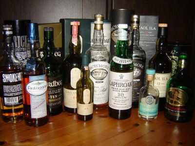 Laphroaig (10 Jahre/40 %/1995?) - sehr torfig, etwas rauchig, leicht ölig, ziemlich salzig, Gras oder Algen, schmeckt sehr nach Mee(h)r, scharfer, langer Abgang.